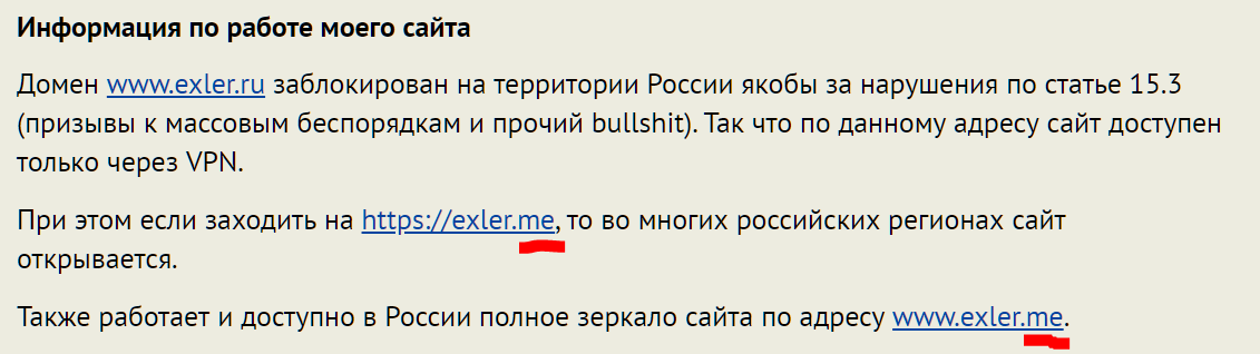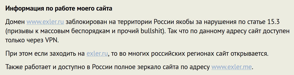 Также работает и доступно в России полное зеркало сайта по адресу www.exler.me.