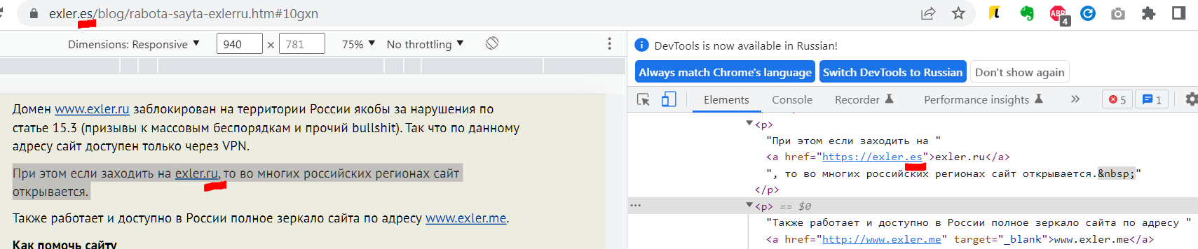 При этом если заходить на exler.ru, то во многих российских регионах сайт открывается.