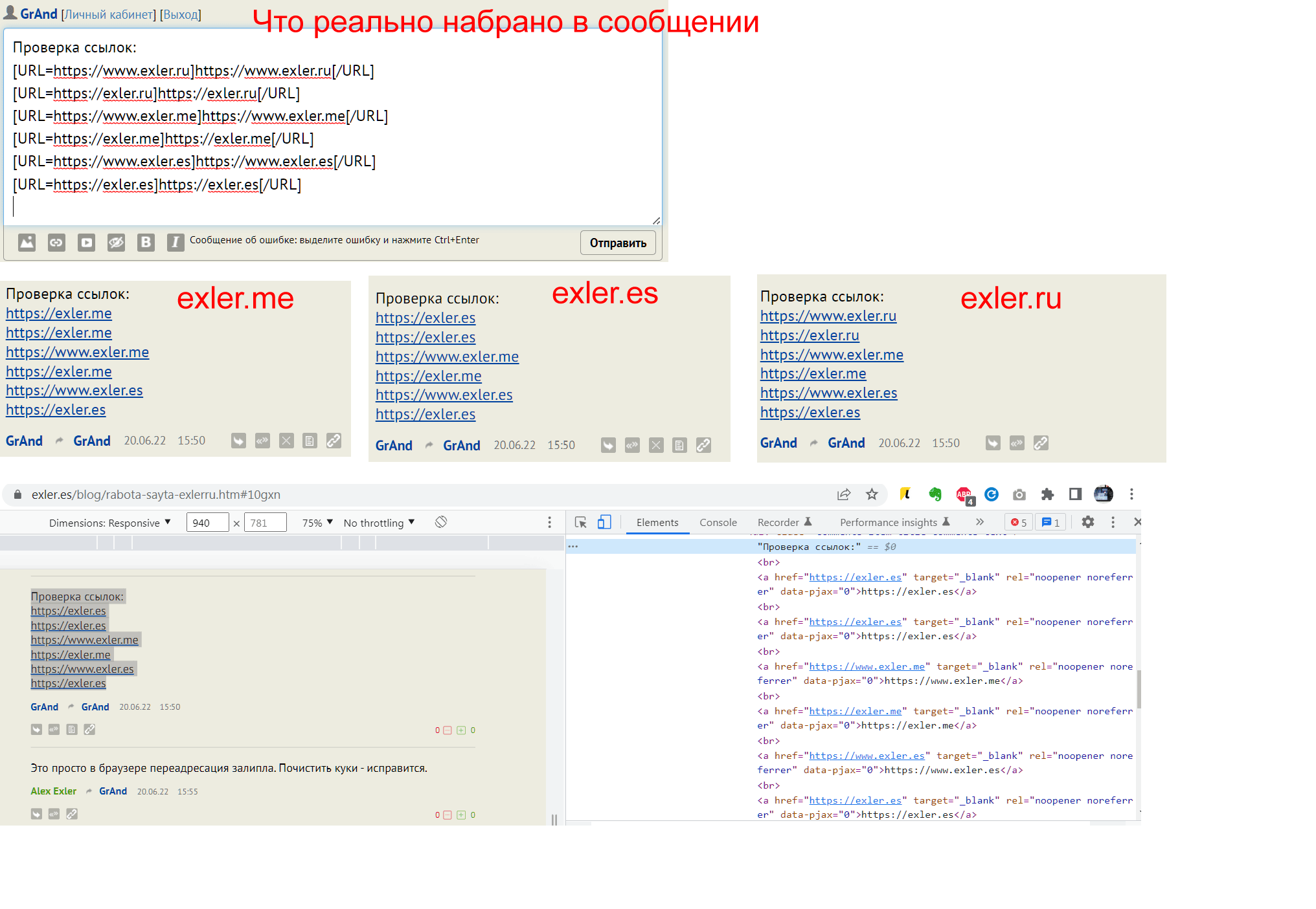 К примеру, выше моё проверочное сообщение со всеми вариантами ссылок выглядит по разному (см. скриншот) в зависимости от того на какой домен я захожу. Причем меняются только две первые ссылки, там где домен .ru.