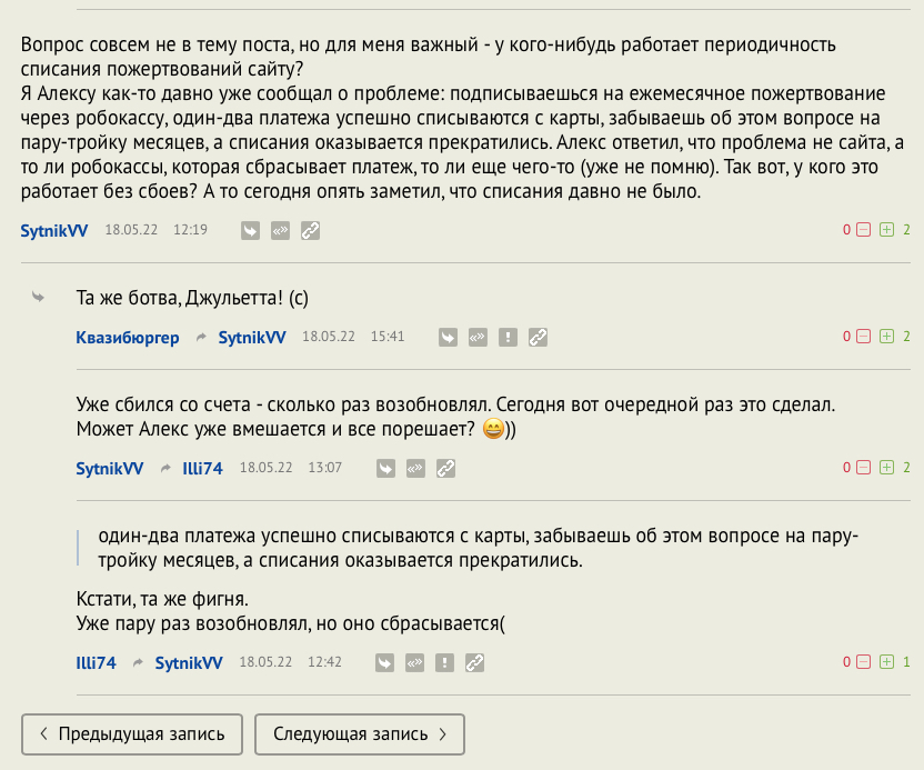 Алекс, я ранее как-то давно обращался с этой проблемой - оформляешь подписку через Робокассу, деньги в лучшем случае списываются пару месяцев, а потом перестают. Т.к. не отслеживаешь такие вещи постоянно, то еще где-то через два-три месяца понимаешь, что отменились списания, снова подписываешься... и по-кругу. По-моему я уже раза три-четыре возобновлял платную подписку, и вот сегодня после этого поста вижу, что подписка снова отключена. Ранее в комментариях я задавал этот вопрос подписчикам, получил ответ, что не у одного меня такое.