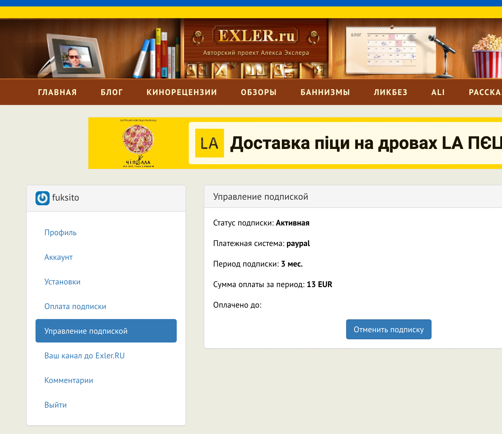 Как можно оформить подписку? Вот в этом разделе вашего личного кабинета на сайте (это для exler.ru, для exler.me - вот здесь). Там выбираете вид оплаты - через "Робокассу" (российские банковские карты или QIWI) или PayPal (любая валюта), выбираете периодичность списывания, указываете сумму подписки для выбранного периода.