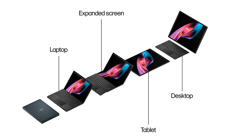 Компания Hewlett Packard выпустила раскладной ноутбук HP Spectre Foldable. Он смотрится как обычный ноутбук, но у него можно расширить экран, а можно и просто вытащить экран и превратить его в 17-дюймовый дисплей с подставкой, получив таким образом десктопный компьютер.
