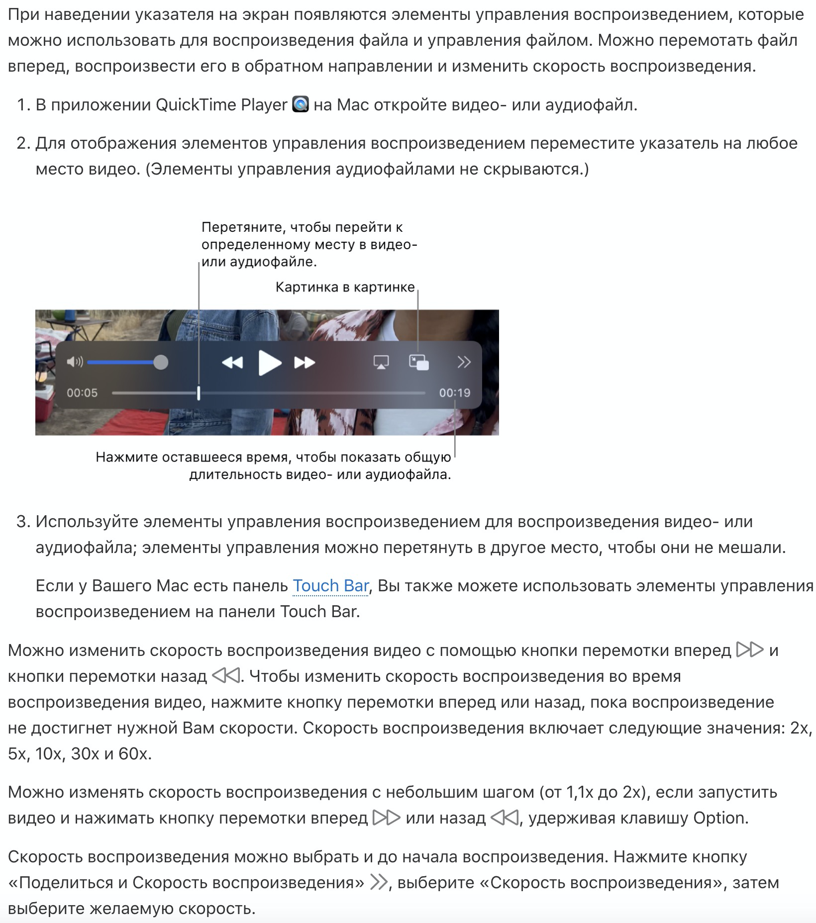 "Можно изменять скорость воспроизведения с небольшим шагом (от 1,1x до 2x), если запустить видео и нажимать кнопку перемотки вперед или назад , удерживая клавишу Option".
