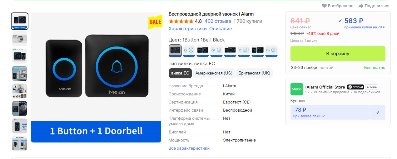 Беспроводной дверной звонок i Alarm за 563 рубля.