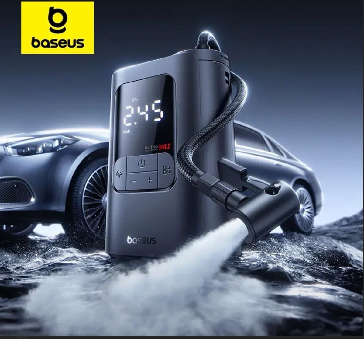 Работает как от провода, так и от встроенного аккумулятора емкостью 7500 мАч, питание проводное и беспроводное, давление до 150 PSI, подходит для авто, великов, мото, мячей. Есть встроенный дисплей.