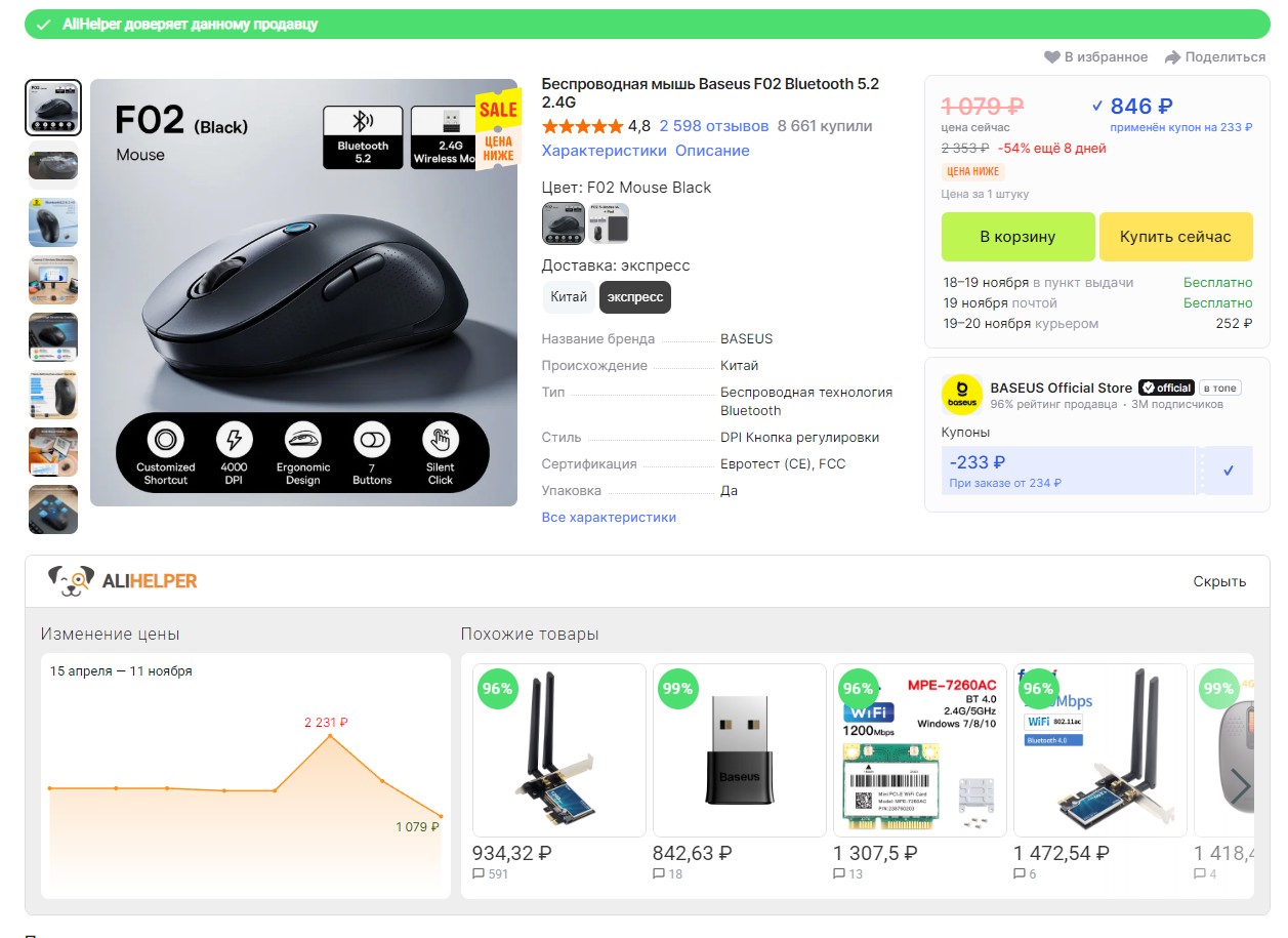 Беспроводная мышь Baseus F02 за 846 р. на AliExpress с купоном продавца и с экспресс-доставкой.