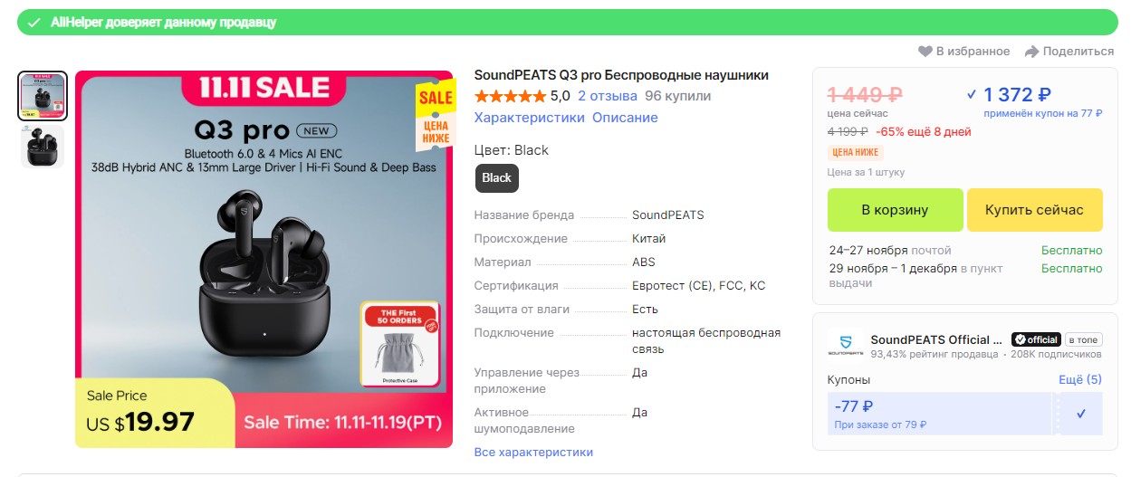 Беспроводные наушники SoundPEATS Q3 pro за 1560 р.