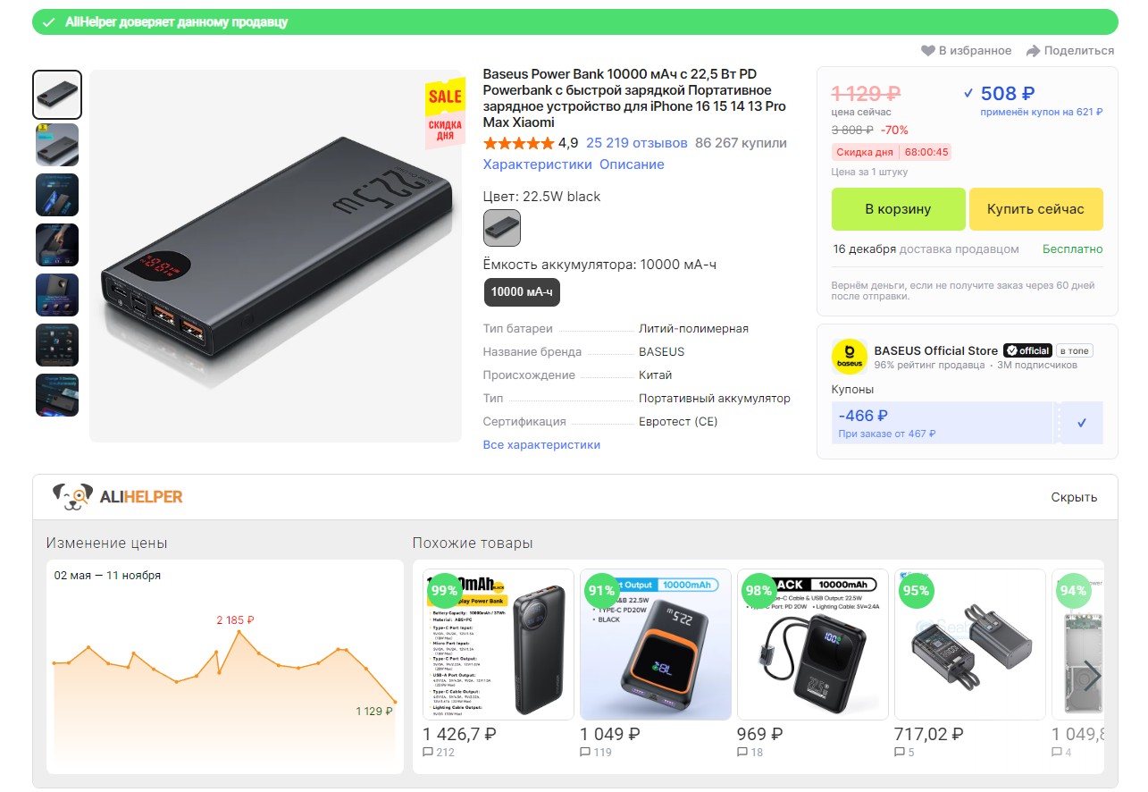 Baseus Power Bank 10000 мАч с 22,5 Вт PD с быстрой зарядкой за 508 р.