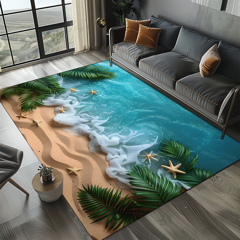 Коврики на пляжно-морскую тему для гостиной. 27 разных вариантов. Хорошо смотрятся в качестве цветового контраста, особенно если комната оформлена в сдержанных бело-серо-бежевых тонах.