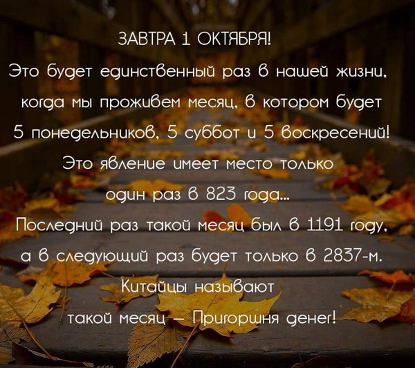 По соцсетям со вчерашнего дня гуляет вот такая смешная картинка. И - да, в этом октябре пять понедельников, суббот и воскресений.