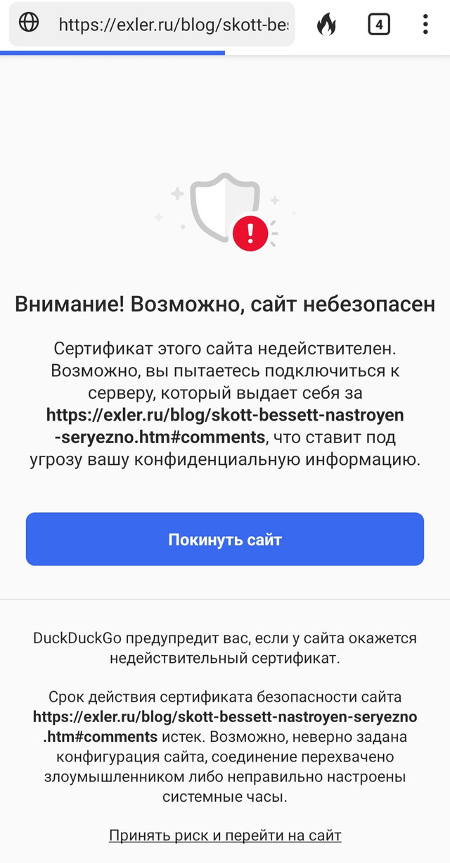 Нет, все-таки это не браузер был виноват, с Exler.ru какая-то хрень происходит - смотрим, что это может быть. С сертификатом там все нормально, сертификат до марта.