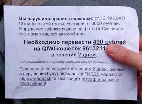 Приятно, что есть не только неравнодушные граждане, но и неравнодушные граждане, желающие заработать. Смотрите, сумма какая продуманная. Меньше 500 рублей - уже не квалифицируется как вымогательство, насколько я знаю. Впрочем, понятно, что их никто ловить не будет, менты заняты совершенно другими делами.
