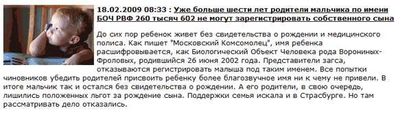 Оно понятно, что родители кретины. Но какая, по большому счету, чиновикам разница, под каким именем регистрировать ребенка? Разве они имеют право отказать в регистрации гражданина, в общем-то, России, основываясь на неблагозвучности его имени? Ребенок-то ни в чем не виноват.