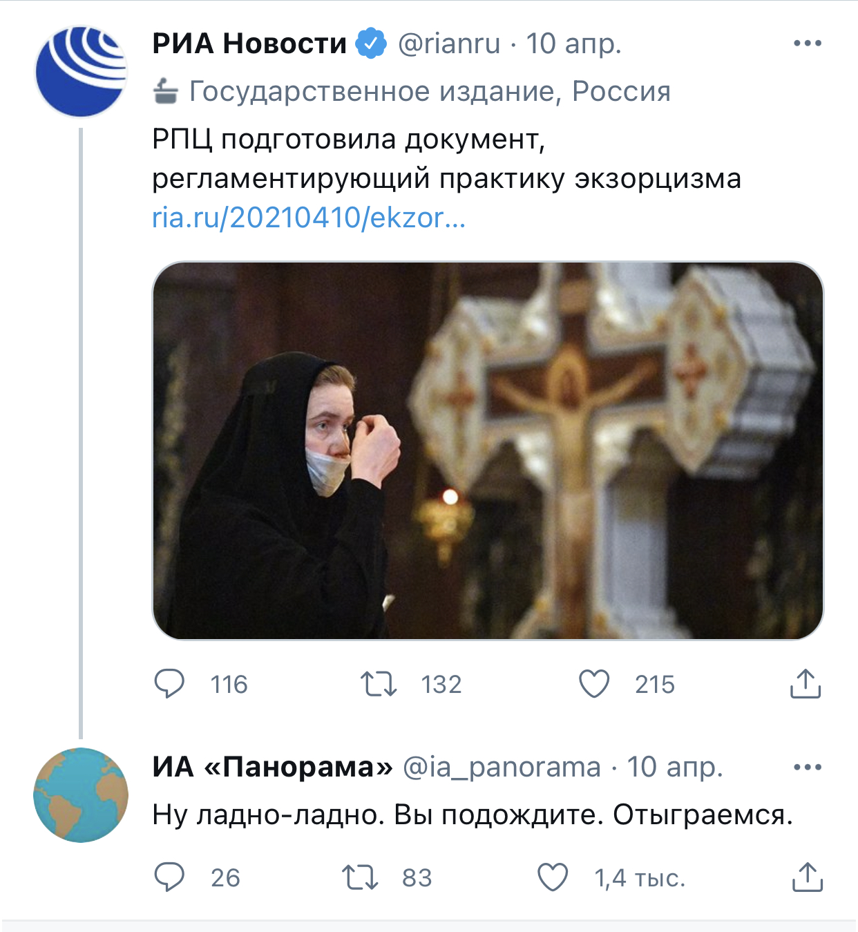 Уверен, что "документ, регламентирующий практику экзорцизма (изгнания бесов)" является нарушением нового запрета на просветительскую деятельность в РФ. Получил ли Илларион (Алфеев) бумажку, разрешающую ему просвещать граждан про изгнание бесов?