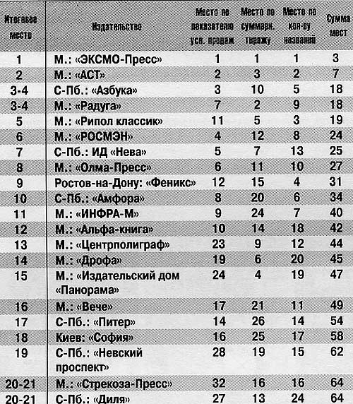 Удивлён тем, что "Росмэн" не в тройке. 3,4 и 5 места ни разу не встречал, а также удивлён, что издательство Дрофа, которая издаёт учебники на всю Россию даже не в 10-ке. Хм...