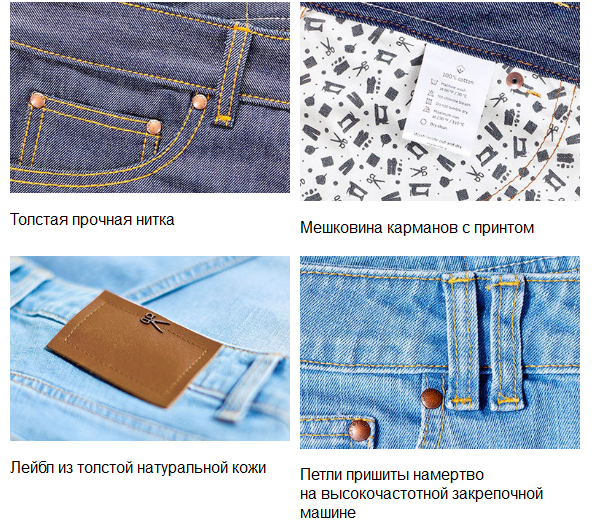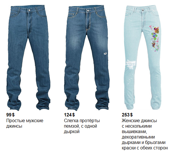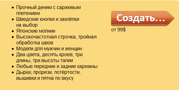У нас собственное производство и прямые продажи. Поэтому джинсы, которые в Москве вы бы купили за 500 $, мы продаём и доставляем в четыре раза дешевле. И мы не обещаем, что в Москве вы найдёте джинсы такого же высокого качества. Цена одной пары — от 99 $. Доставка курьером в любую точку Европы и СНГ — 20 $.
