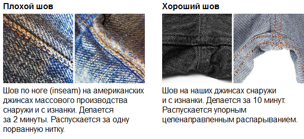На шов по ноге (inseam) приходится самая большая нагрузка (особенно в паху, на внутренней поверхности бедра и на ботинках). У нас в этом месте тройной запошивочный шов с закрытым стежком (lockstich): нитка закреплена снаружи и изнутри. Чтобы распотрошить такой шов, нужно фанатично распарывать его стежок за стежком. Для сравнения, хорошие американские джинсы делают перекрёстным стежком (chainstitch), который распускается за одну порванную нитку. А в основном — вообще простым оверлоком.