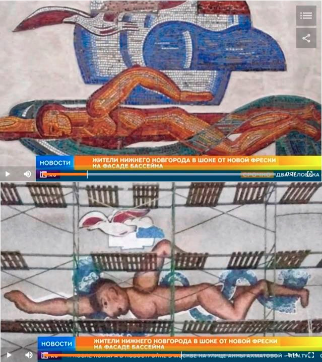Upd: В бассейне Нижнего Новгорода классно мозаику с пловцом отреставрировали. Было и стало.