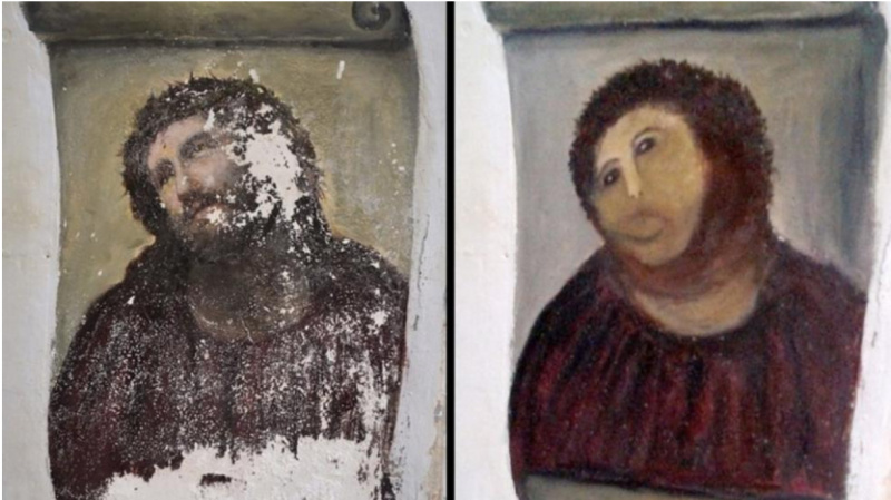 Ну и сразу начали вспоминать аналогичный скандал, когда в Сарагосе прихожанка местной церкви попыталась восстановить фреску с изображением Иисуса кисти Элиаса Гарсиа Мартинеса. Тоже получилось довольно живенько.