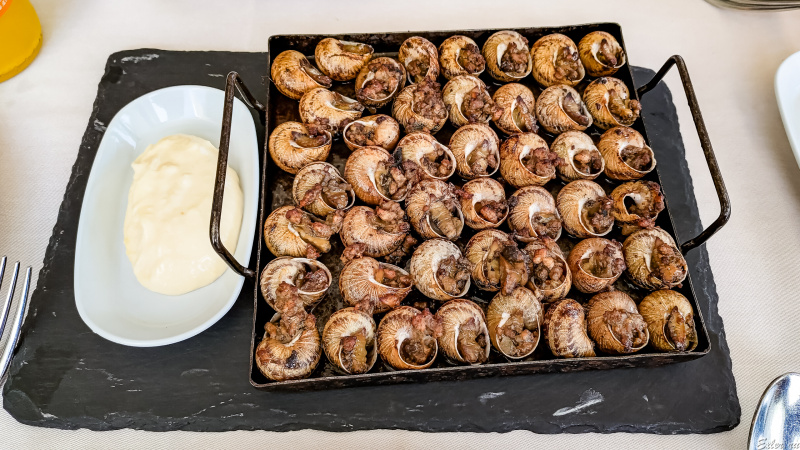 Первый раз там заказал моих любимых улиток (caracolles). Я их во всех приличных ресторанах заказываю - пробую. И везде их по-разному готовят. Иногда просто запекают на гриле и отдельно подают сырный соус (это самая ерунда). Есть с мясным фаршем, который добавляется в каждую улитку (вот это - самое оно). Есть еще вариант, когда их готовят вместе со свиными ножками и с ними подают (тоже отличный вариант).
