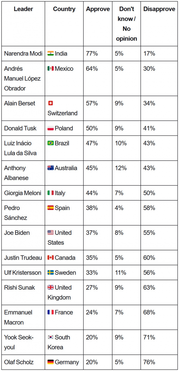 Восемь стран имеют глав государств и правительств с рейтингом неодобрения выше 50%, включая премьера Испании Педро Санчеса, президента США Джо Байдена и премьер-министра Канады Джастина Трюдо.