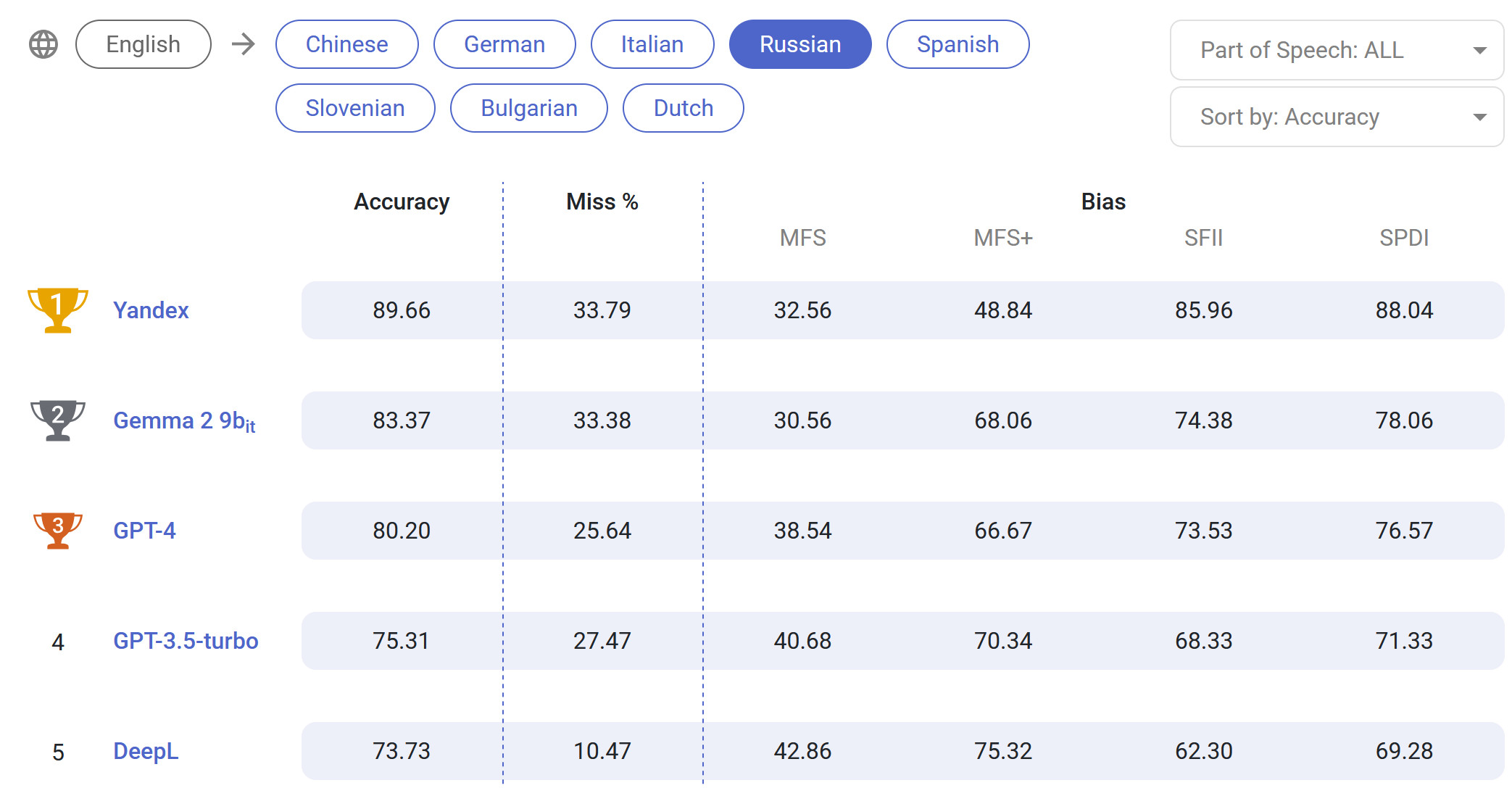 Несколько неожиданно (хотя, впрочем, можно было ожидать) выглядит первая пятерка переводов с английского на русский - тут переводчик Yandex (с Yandex GPT) на первом месте.