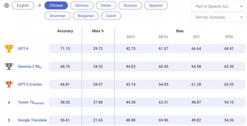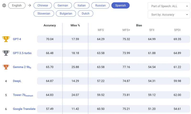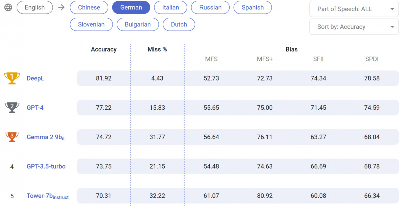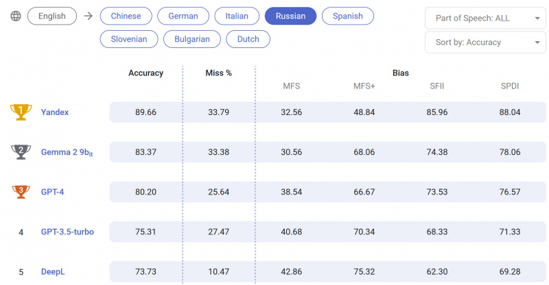 Международный независимый бенчмарк DiBiMT – это эталонный тест для измерения процента ошибок в переводах. Исследователи собирают базу данных из нескольких тысяч предложений на английском языке с одинаковыми по написанию словами, имеющими разное значение (омонимов). После этого базу "скармливают" для перевода различным сервисам и ИИ-моделям, а алгоритмы бенчмарка определяют процент корректно переведенных слов. Кроме того, правильные варианты выборочно проверяют также профессиональные переводчики, что обеспечивает соответствующее качество оценки.