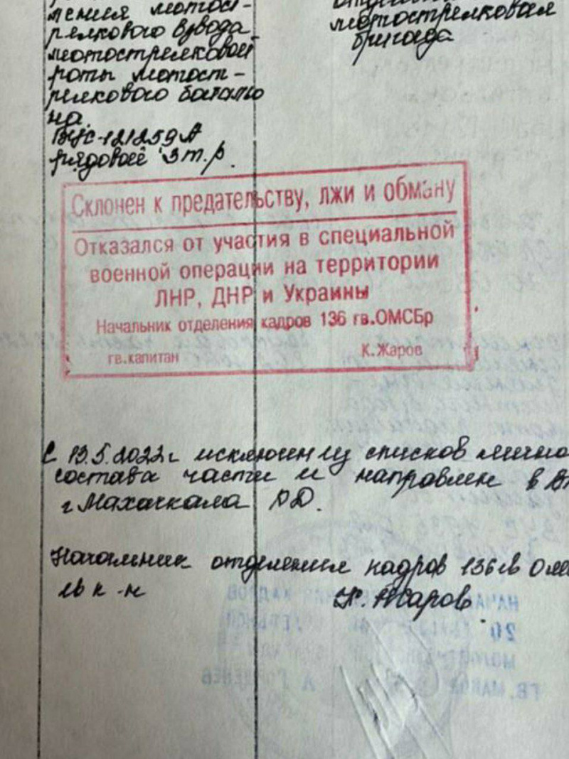 Телеграм-канал "Военный омбудсмен" сообщает, что такой штамп в военный билет получают военные, отказавшиеся ехать на войну в Украину. Интересно, они для всех отделов кадров такие штампики заказали?