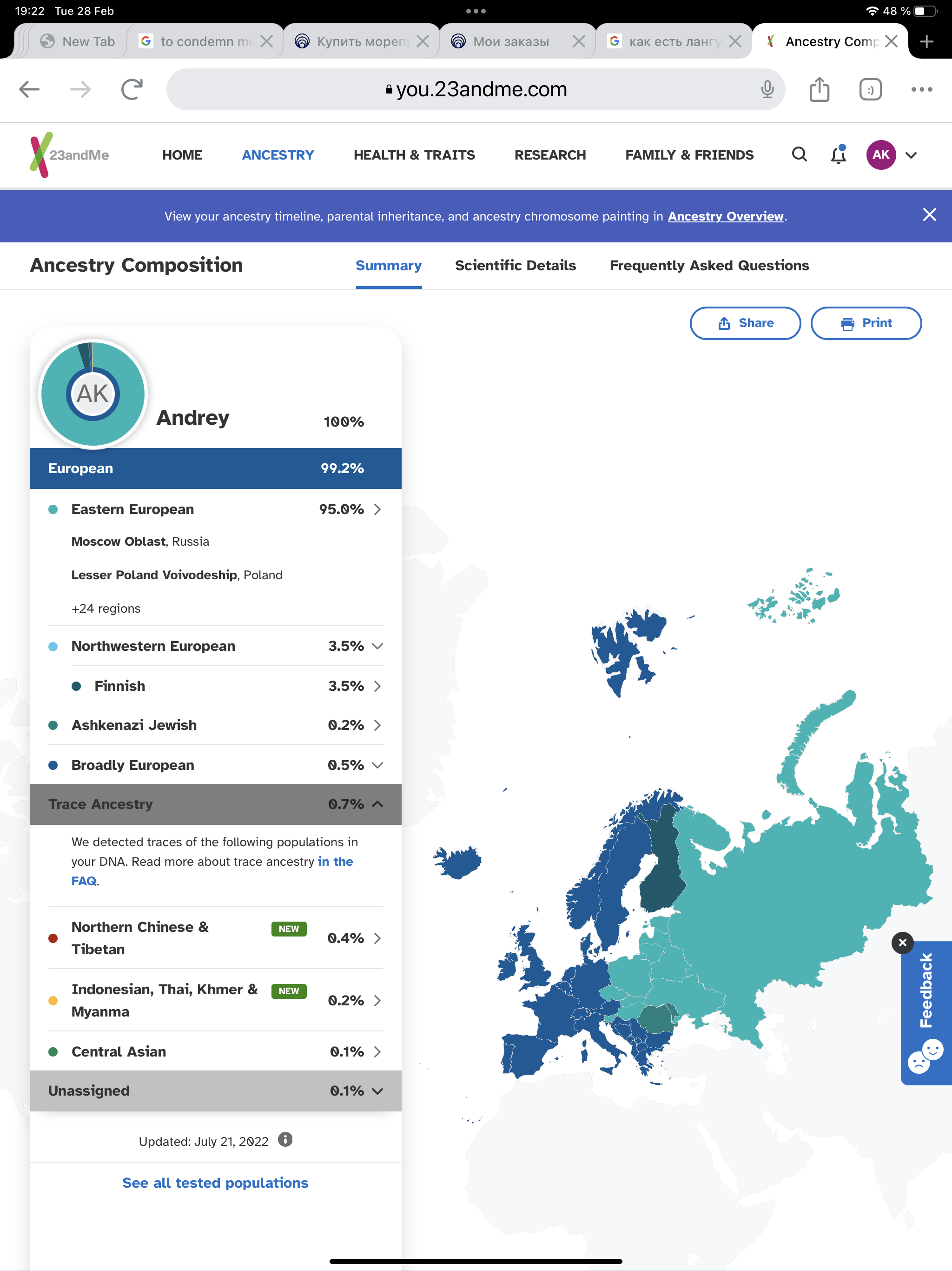 В MyHeritage давали хорошую скидку, и мы заказали тесты ДНК на этническую принадлежность на всю семью.
