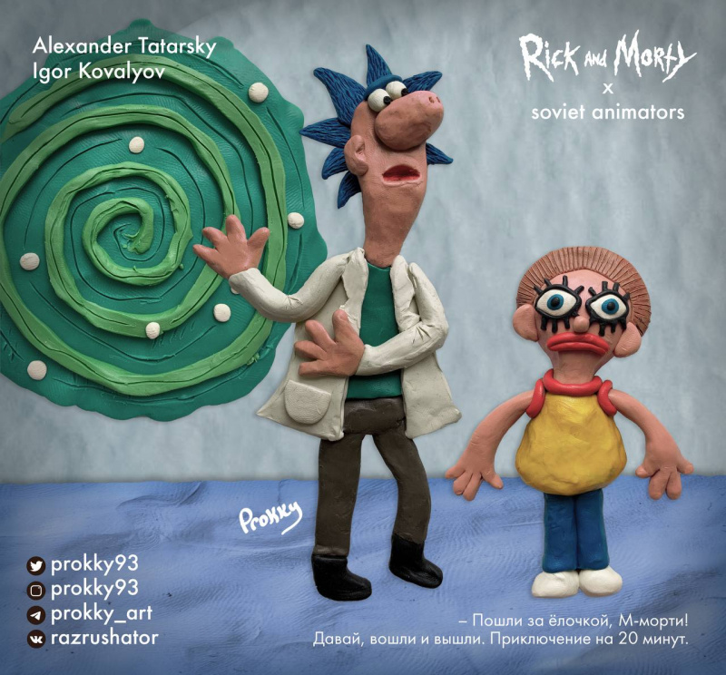 • Рик и Морти в стиле Александра Татарского (1950 – 2007) и Игоря Ковалёва (род.1954), создавших пластилиновые мультфильмы «Пластилиновая ворона», «Падал прошлогодний снег», а также рисованные «Крылья, ноги и хвосты», «Следствие ведут колобки» и многие другие.