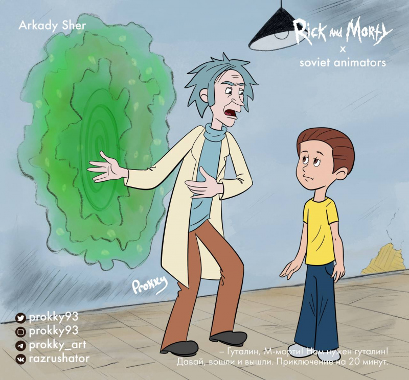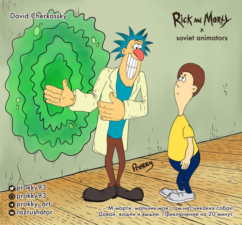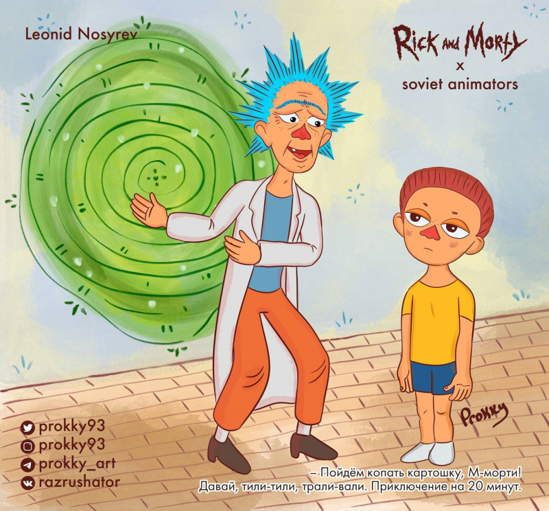 Российский художник Прокопий "Prokky" Уляшов (вот его телеграм-канал) к премьере шестого сезона "Рика и Морти" изобразил персонажей в стилистике советских мультипликаторов. На мой взгляд, получилось очень здорово.