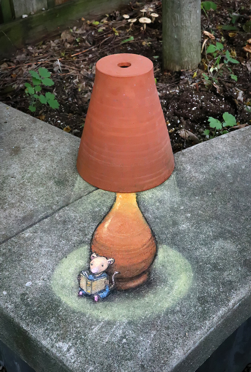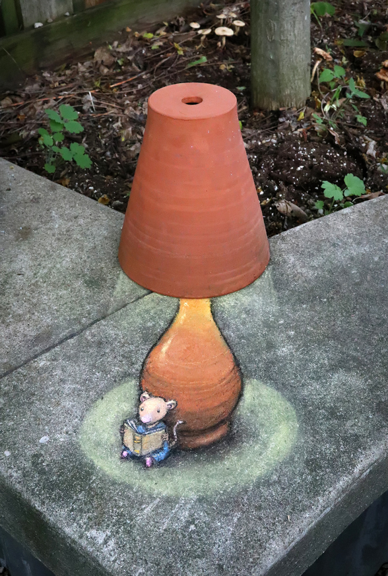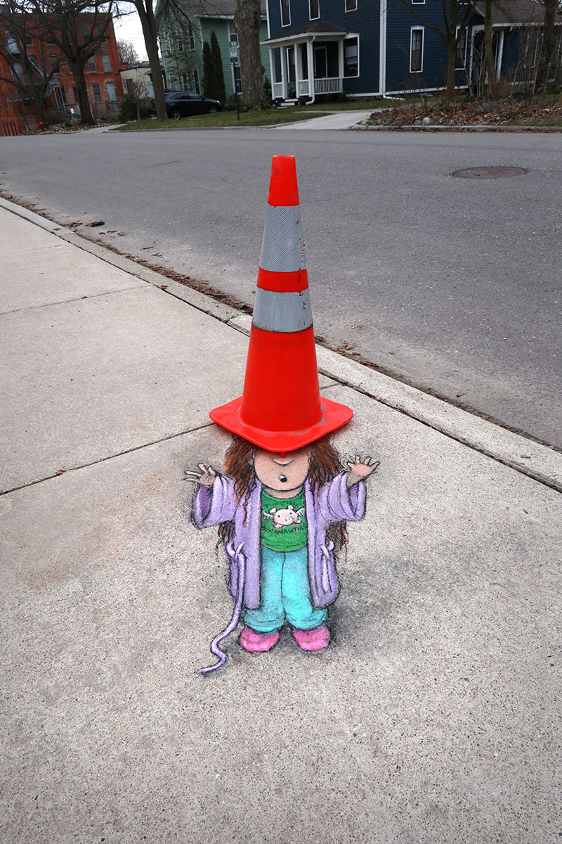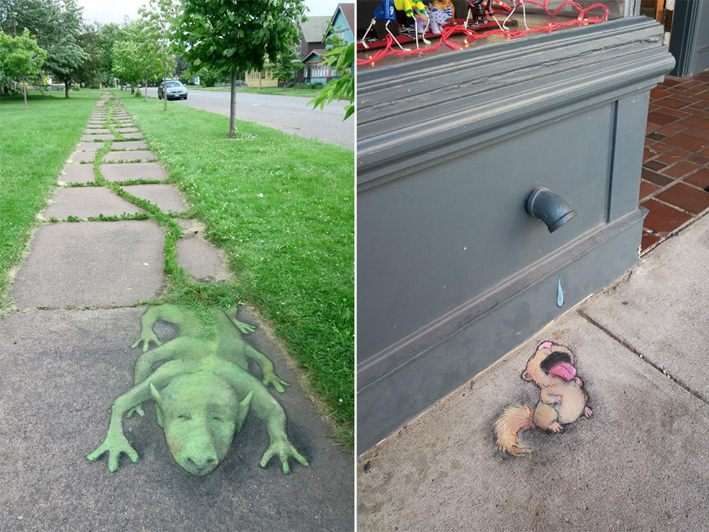 Дэвид Зинн (Davin Zinn) - американский художник, живущий в городе Энн-Арборе (США, штат Мичиган). Он рисует очень забавные трехмерные картинки мелом, обыгрывая элементы уличного ландшафта. Вот его сайт, и вот несколько примеров его работ: по вполне понятным причинам эти изображения очень недолговечные, но Дэвид их собирает в виде фотографий и выкладывает на сайте.