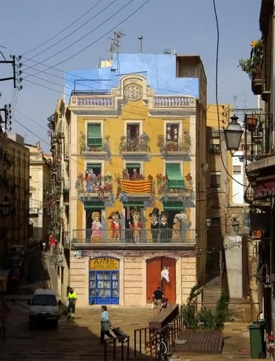 В праздник, когда и так половина балконов с каталонскими флагами и на каждом люди, даже не сообразишь сразу, что это рисунок!