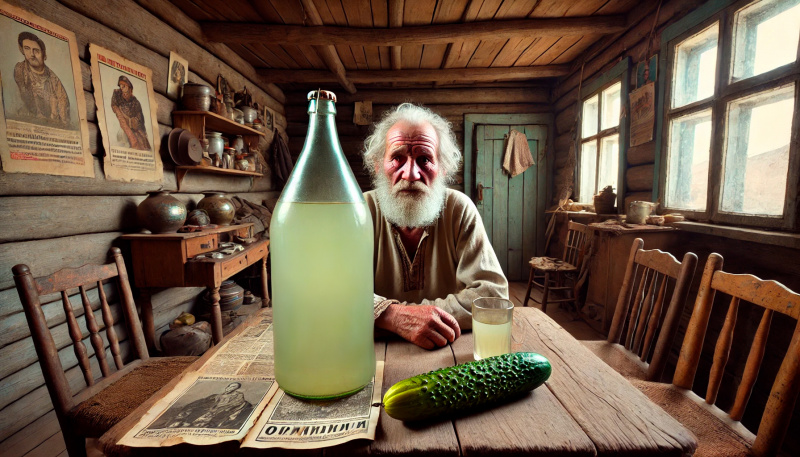 Жёлто-зелёный цвет напитка намекает на то, что это рассол с того самого огурца. Самогон всё же в худшем случае мутно-белый.