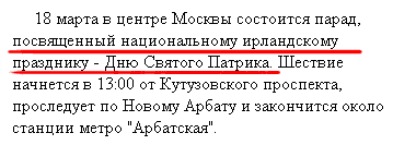Скажите, только я один не понимаю, что в центре Москвы будет делать парад, посвященный ирландскому празднику - Дню святого Патрика? С какой стати мы теперь так пышно, с перекрытием движения, отмечаем ирландский праздник, о котором процентов 95 россиян вообще в первый раз в жизни слышат?