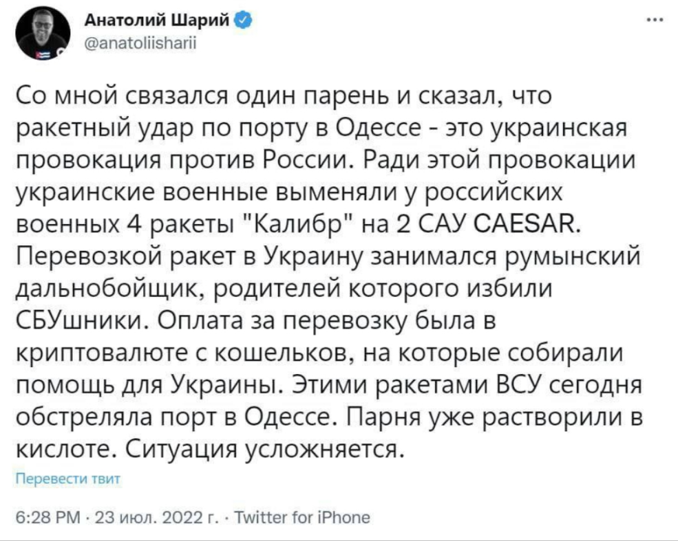 Россия не имеет никакого отношения ко вчерашнему обстрелу одесского порта, произошедшему ровно на следующий день после подписания договоренностей в Турции. Это венерианские скалозубы, кто же еще?