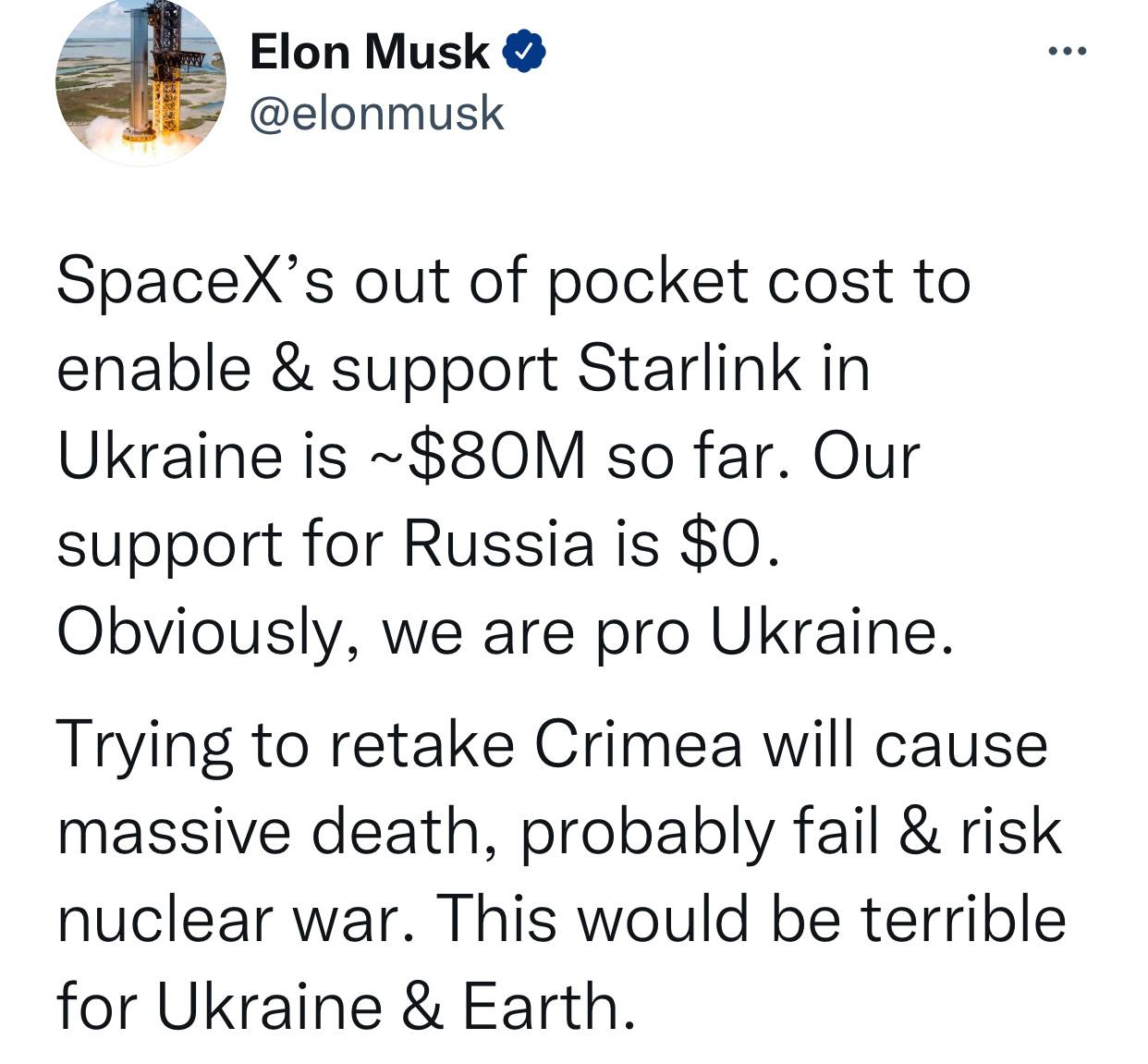 Я может чего-то упустил, но Маск нигде не говорил, что путлер хоть в чём-то прав, особенно в том, что развязал эту войну. Да Маск сказал очень противоречивое мнение (особенно про Крым и Хрущёва), которое может не понравится почти всем украинскому эстеблишменту. Но, это НЕ оправдание агрессии, НЕ оправдание терроризма, НЕ оправдание холокоста (и еще кучу всего, чего действительно нельзя оправдывать), это всего-лишь крайне противоречивое мнение. И называть высказывание мнения "проступком", т.е. "деянием, за которое надо нести ответственность", это неправильно, так как проступок - это как раз высказывание того, чего нельзя говорить, а это все уже похоже на избирательную свободу слова.
