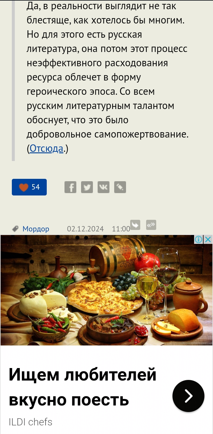 Да, в реальности выглядит не так блестяще, как хотелось бы многим. Но для этого есть русская литература, она потом этот процесс неэффективного расходования ресурса облечет в форму героического эпоса. Со всем русским литературным талантом обоснует, что это было добровольное самопожертвование. (Отсюда.)