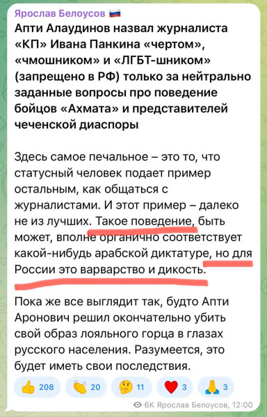 Рамзан как политик на порядки умнее чем его воспринимают, судя по всему грамотно разыгрывает партии, поднимает ставки когда надо и склоняет кого надо к уступкам, своих целей добивается, простака он из себя только строит. И не разу не садился в лужу как вот этот невменько Лапти Алладина.