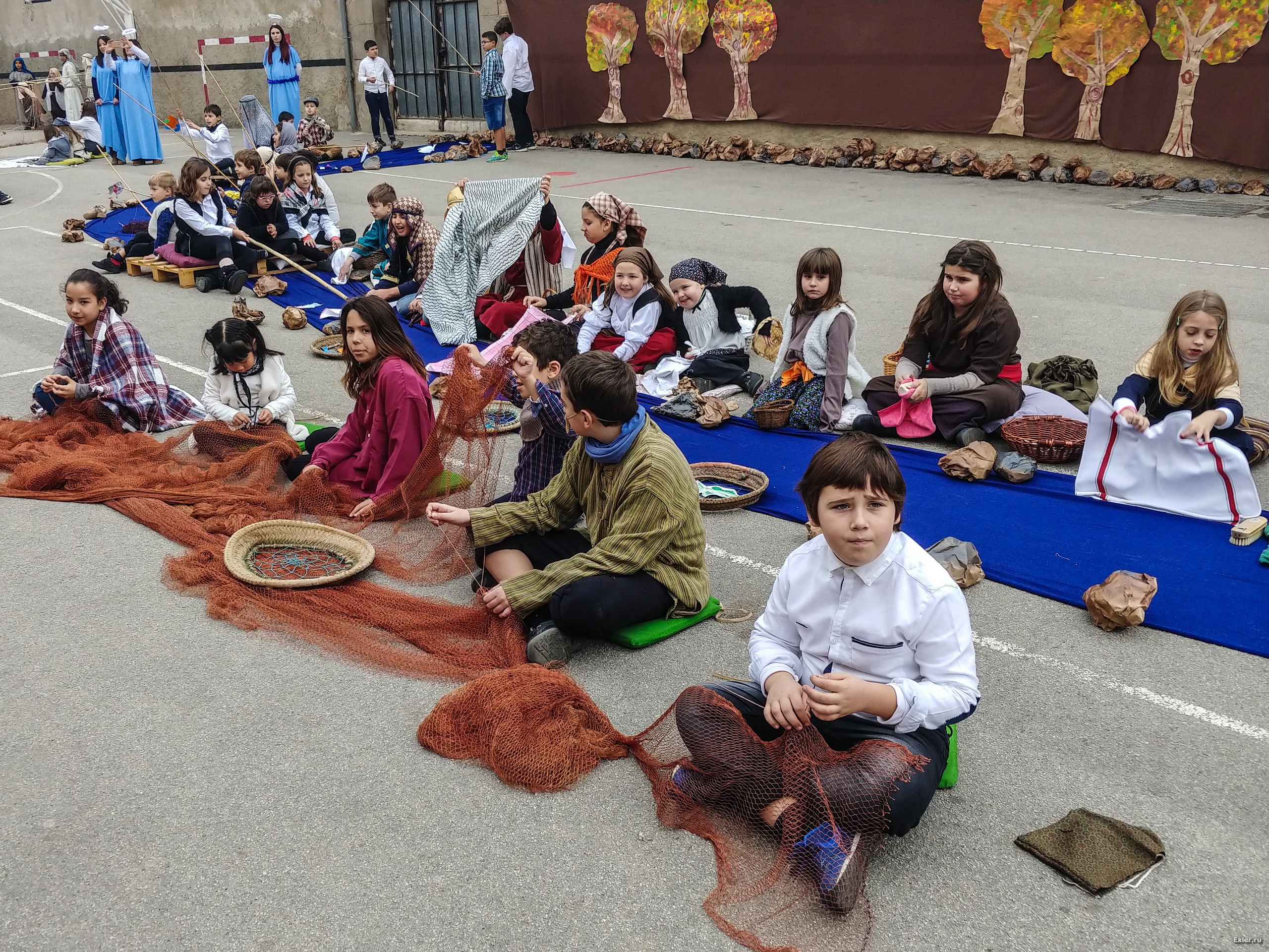 И тут же начинается инсталляция: одни рыбаки ловят рыбу, другие чинят сети, женщины стирают белье. Все одеты так, как одевались в Палестине 2017 лет назад. Поэтому младшему Экслеру не было разрешено надеть бейсболку Бруно Марса.