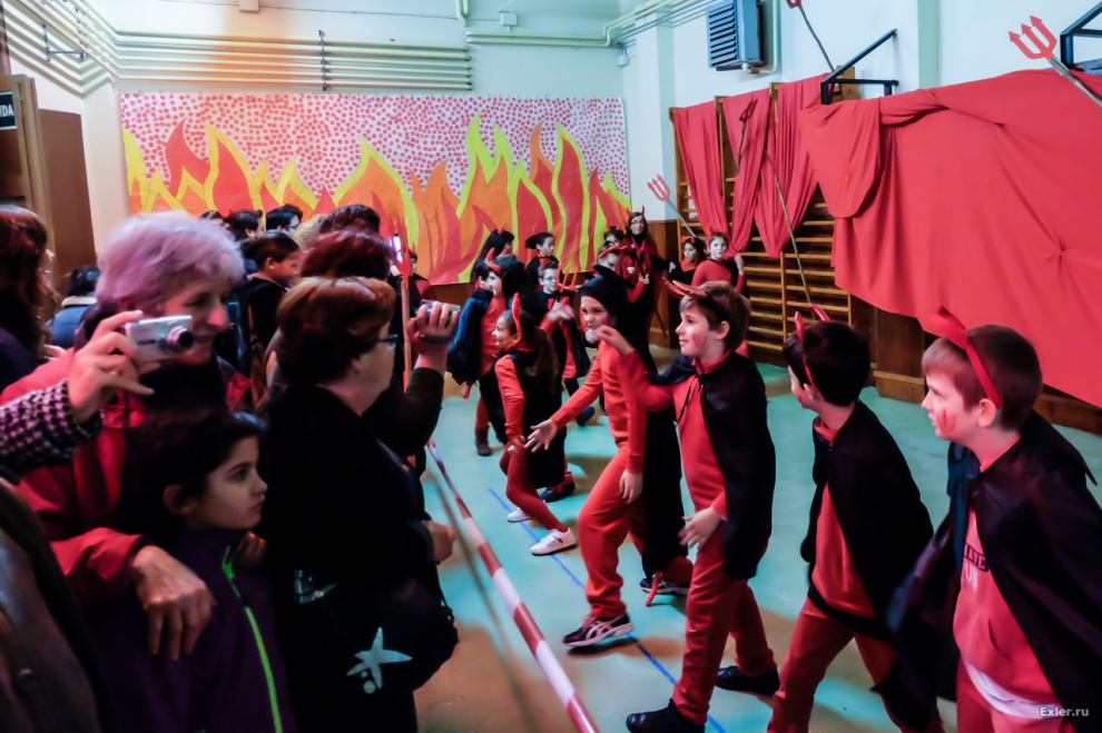 В спортзале, как и полагается, Преисподняя. Черти скачут туда-сюда под зажигательную музыку на радость родителям.
