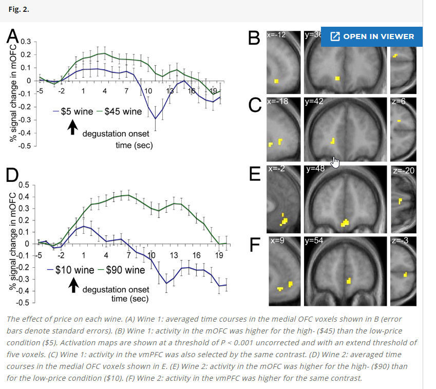 Несмотря на важность и повсеместное распространение маркетинга, практически ничего не известно о нейронных механизмах, с помощью которых он влияет на решения, принимаемые человеком. Мы предполагаем, что маркетинговые действия, такие как изменение цены продукта, могут влиять на нейронные репрезентации ощущаемой приятности. Мы проверили эту гипотезу, просканировав испытуемых с помощью функциональной МРТ во время дегустации вин, которые, по их мнению, вопреки реальности отличались друг от друга и продавались по разным ценам. Результаты показали, что увеличение цены вина повышает субъективные оценки приятности вкуса, а также активность, зависящую от уровня кислорода в крови, в медиальной орбитофронтальной коре - области, которая, как принято считать, кодирует приятность вкуса в ходе выполнения экспериментальных задач. В статье приводятся доказательства способности маркетинговых акций модулировать нейронные корреляты приятности вкуса и механизмы, через которые этот эффект действует.