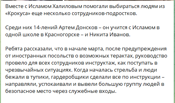 Полиция самоустранились, группа быстрого реагирования спряталась, нападение террористов длилось 18 минут, около 20:15 боевики уехали. Те, кто мог, эвакуировался самостоятельно. Многие двигаться не могли — и либо задыхались в дыму, либо лежали, истекая кровью. Машины скорой помощи прибыли к «Крокусу» около 20:30.