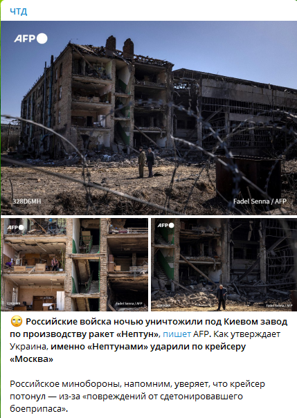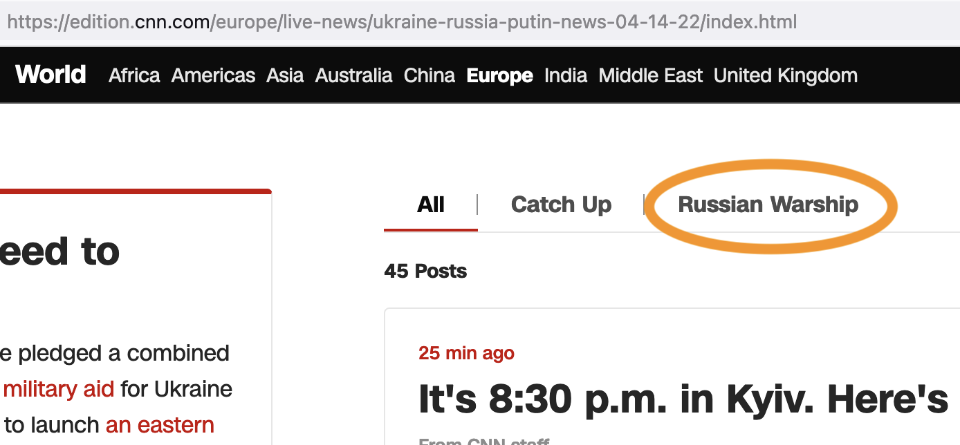 Пресс-секретарь Пентагона Джон Кирби: крейсер «Москва» способен идти своим ходом, и он движется в восточном направлении. Мы думаем, что его, вероятно, поставят в Севастополь на ремонт (Отсюда.)