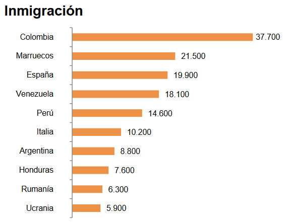 Основными национальностями иммигрантов, прибывших в Испанию во втором квартале, были колумбийцы (37 700 прибывших в Испанию), марокканцы (21 500) и испанцы (19 900), поскольку некоторые уроженцы, живущие за границей, решили вернуться в страну. Самыми многочисленными эмигрантами были марокканцы (6 700 выбывших, в результате чего чистый прирост составил 14 800 жителей), румыны (5 700) и, опять же, испанцы (5 500).