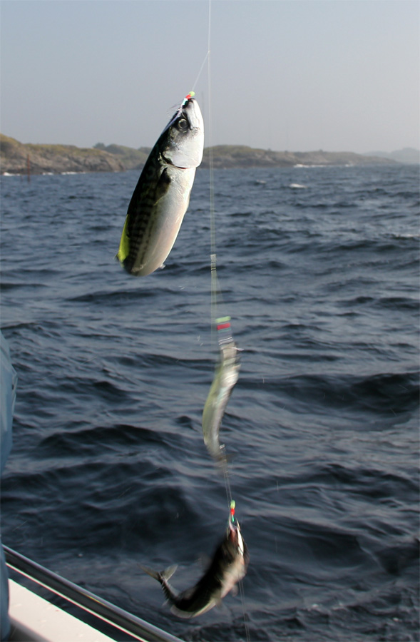 Здесь - все не так. Технология ловли принята следующая: забрасываешь снасть до самого дна, а глубины тут бывают сорок метров, шестьдесят и даже больше - до ста двадцати. Потом поднимаешь грузило чуть повыше и слегка дергаешь спинингом - привлечь внимание рыбки. Затем начинаешь сматывать леску - при этом, скорее всего, на одном, двух, трех и даже сразу пяти крючках уже что-то будет сидеть. Да-да, тут рассусоливать, курить или задумываться - времени нет. Рыба ловится в промышленных количествах.