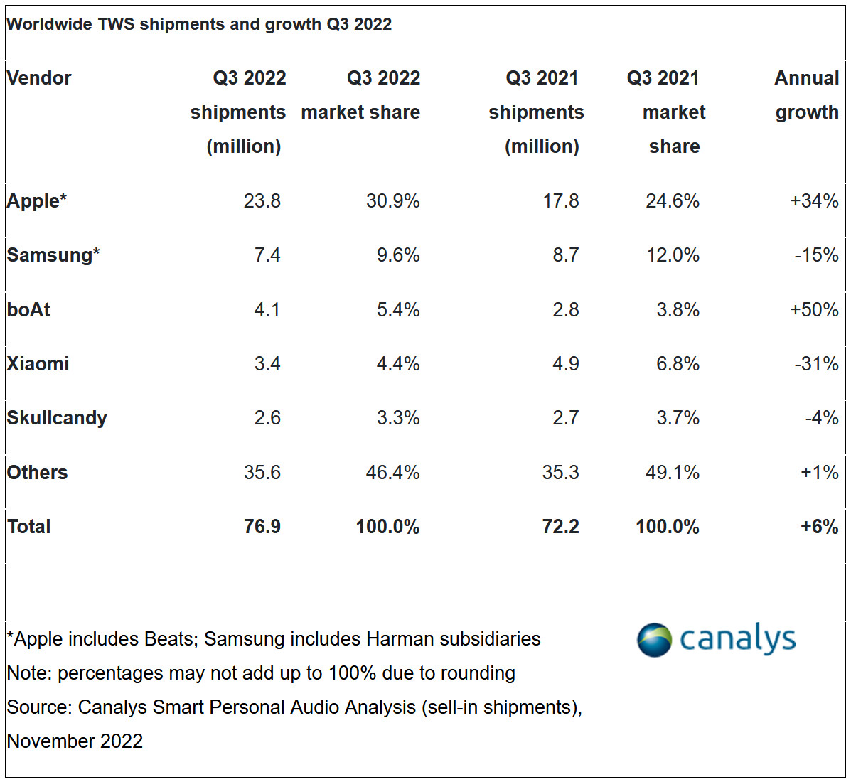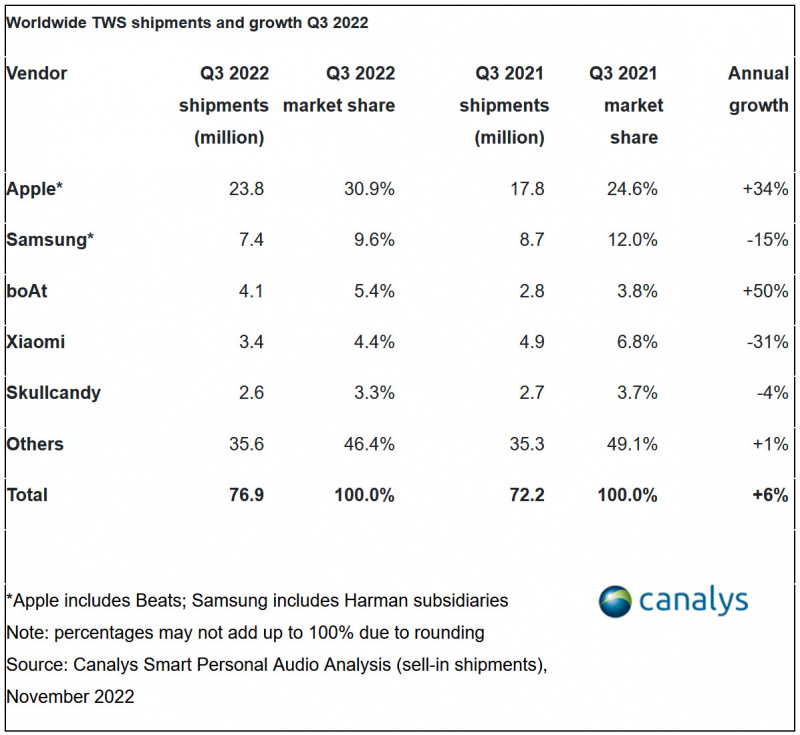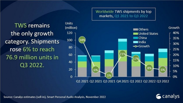 Аналитическая компания Canalys опубликовала отчет о состоянии рынка беспроводных TWS-наушников на третий квартал 2022 года. Всего продали 76,9 миллионов, рост составил 6% (в прошлом году прирост был выше).