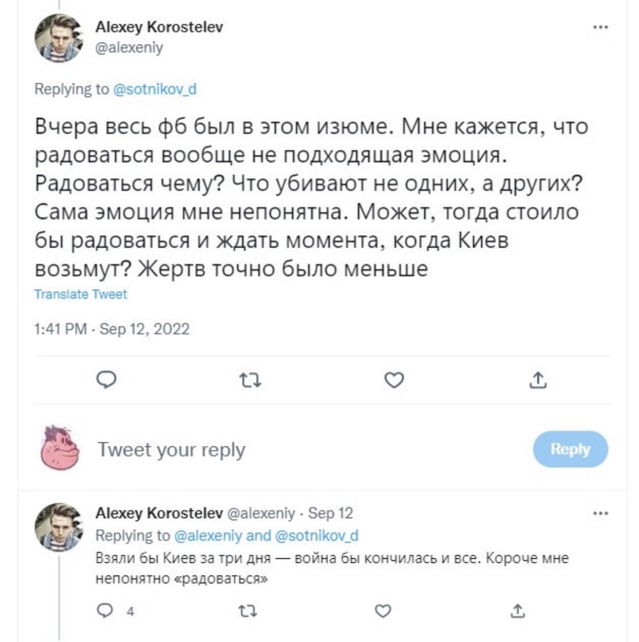 Освобождение Изюма - это 11 сентября (твит от 12 сентября). Начало могилизации - 21 сентября. Так что тогда даже чмобиков на фронте не было, были контрактники и добровольцы, которые в армии по своей воле. Но для Коростелева и они "наши мальчики", наверное. И их тоже очень жаль.