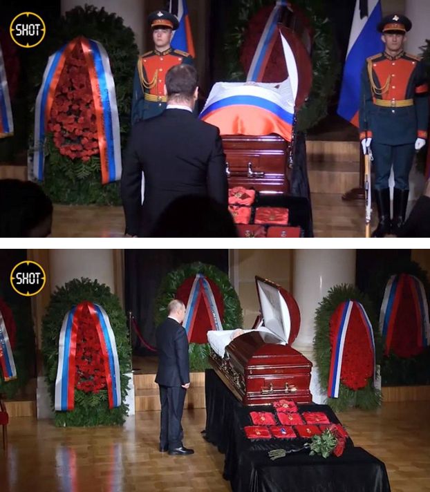 На первой фотке Медведев, сзади гроба - караул и государственные флаги. На второй - караула нет, что, конечно, для законченного параноика Путина - нормально: караул же с сабельками, а вдруг пырнут. Но тогда вопрос - куда делись флаги и почему видоизменилась ручка в передней части гроба: на втором кадре она имеет заметное латунное утолщение справа.