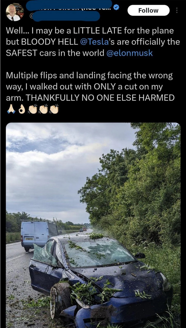 Пользователь восхитился своей Tesla, которую он назвал самой безопасной машиной: после многочисленных переворотов и приземления в обратную сторону поперек движения он получил всего лишь порез на руке. Да здравствует Tesla!